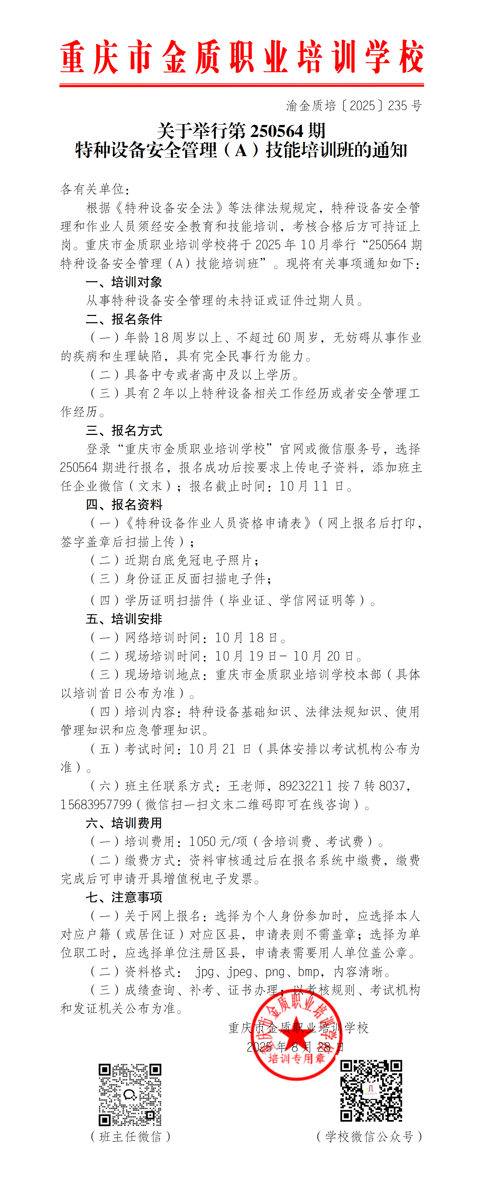 10月第250564期特种设备安全管理(A)技能培训班的通知