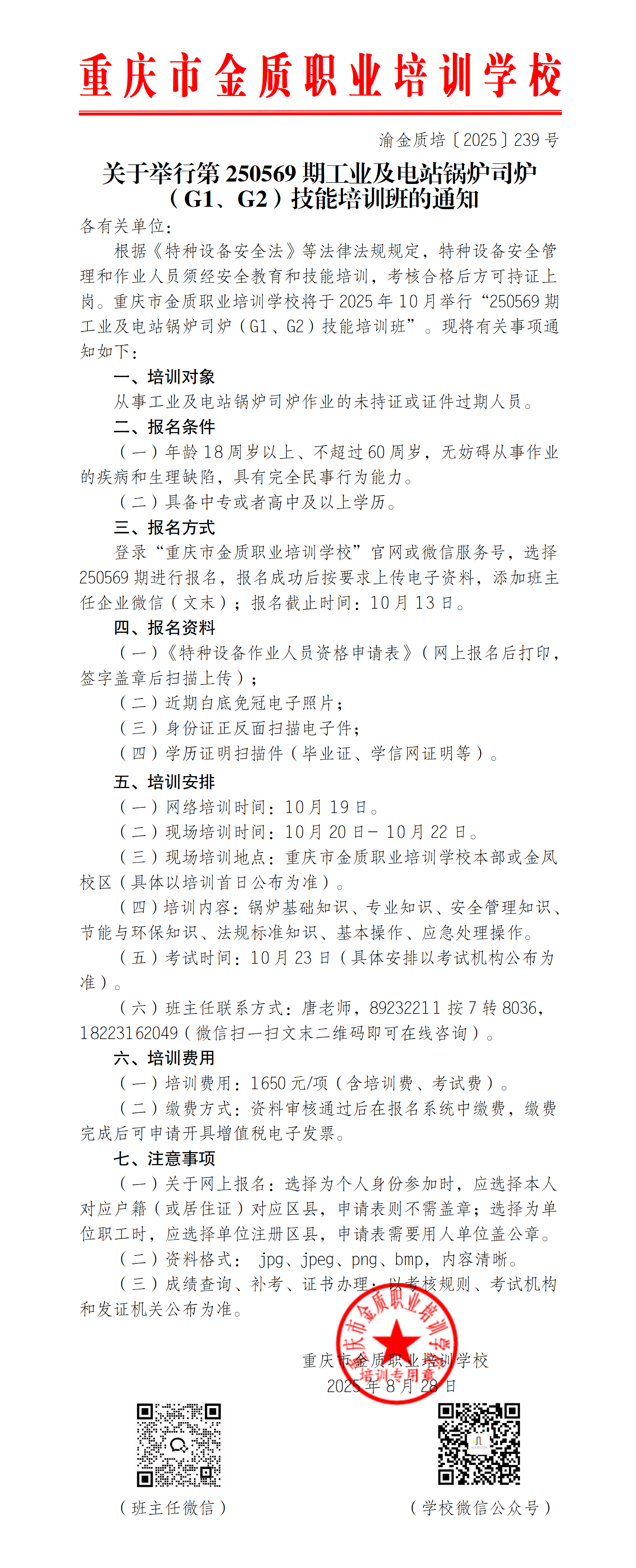 10月第250569期工业及电站锅炉司炉(G1、G2)技能培训班的通知