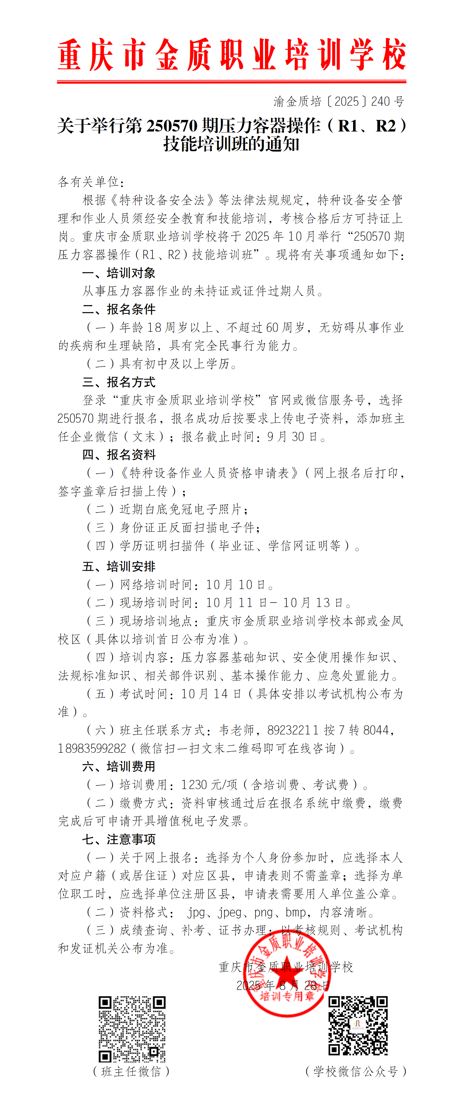 10月第250570期压力容器操作(R1、R2)技能培训班的通知