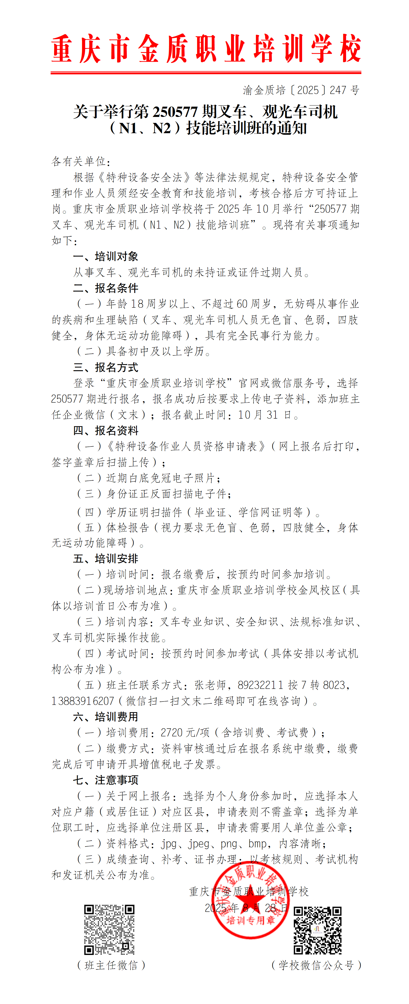 10月第250577期叉车、观光车司机(N1、N2)技能培训班的通知