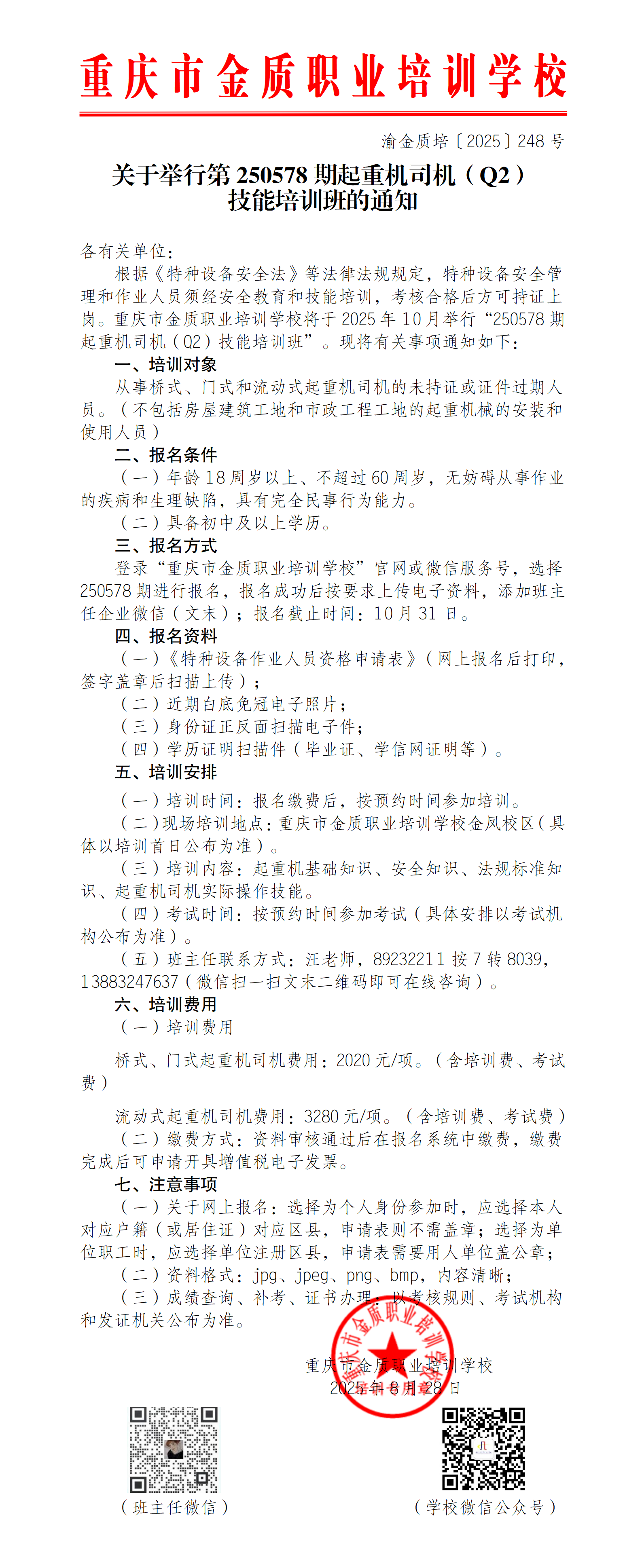 10月第250578期起重机司机(Q2)技能培训班的通知