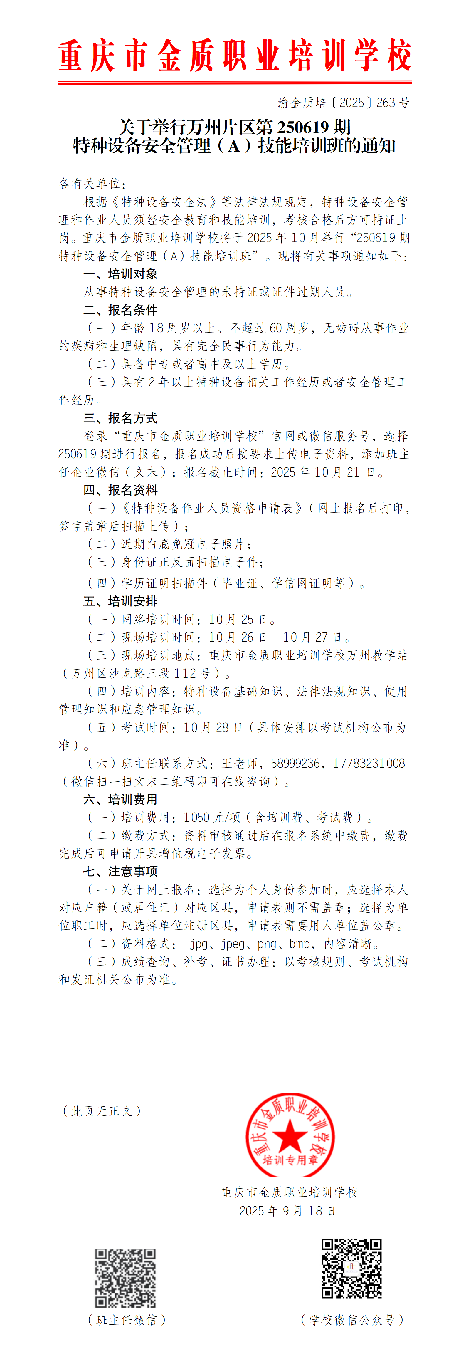 10月万州片区第250619期特种设备安全管理(A)技能培训班的通知
