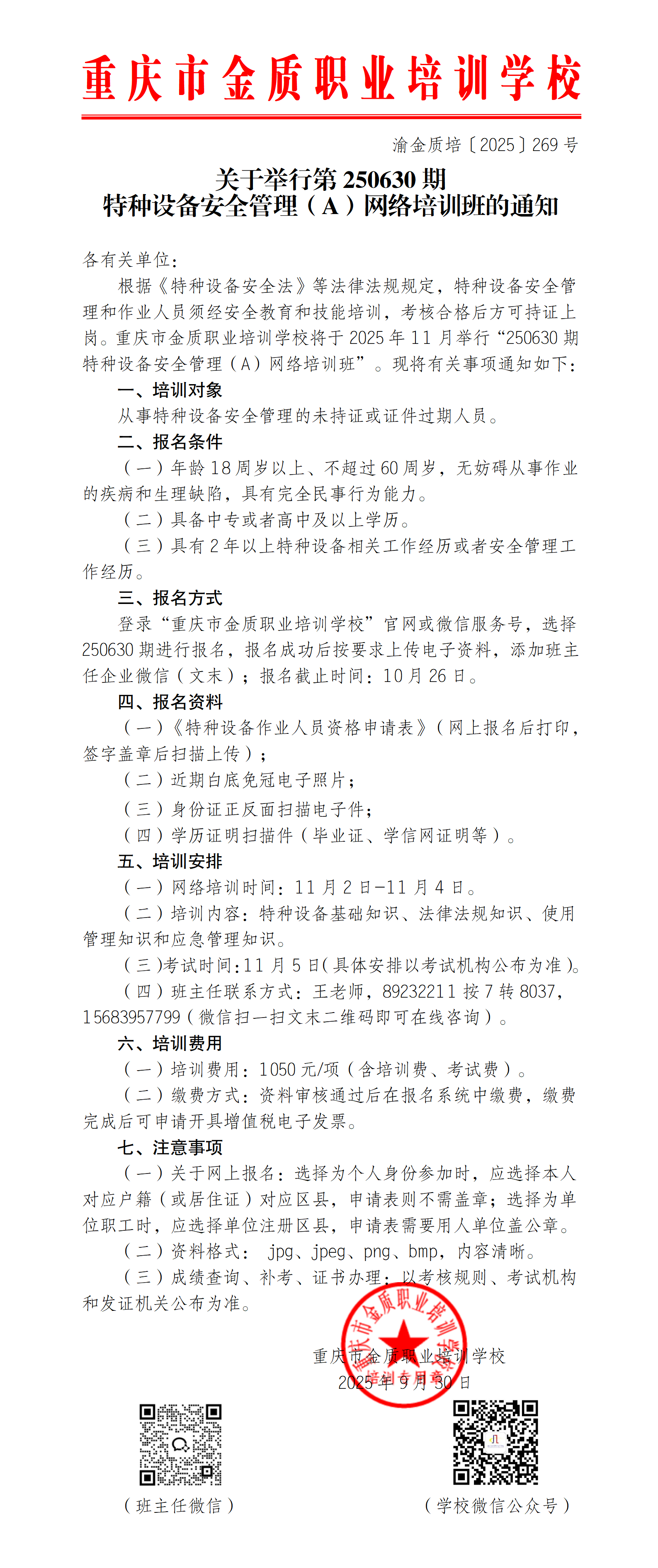 11月第250630期特种设备安全管理(A)网络培训班的通知