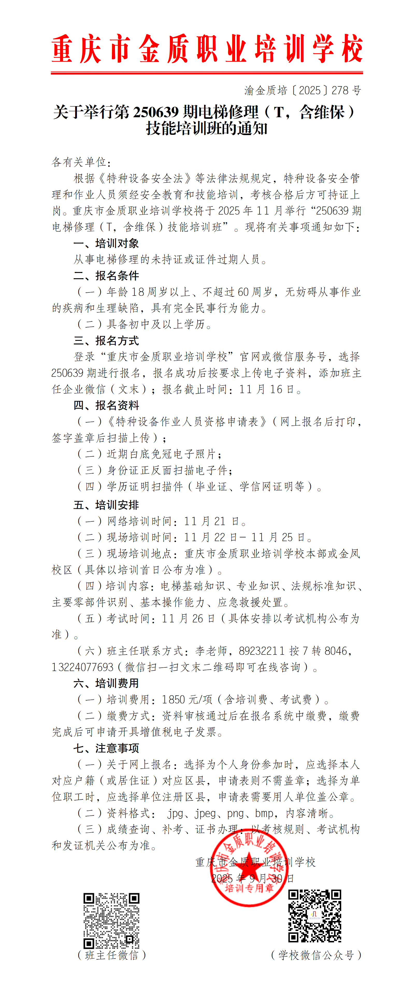 11月第250639期电梯修理(T,含维保)技能培训班的通知