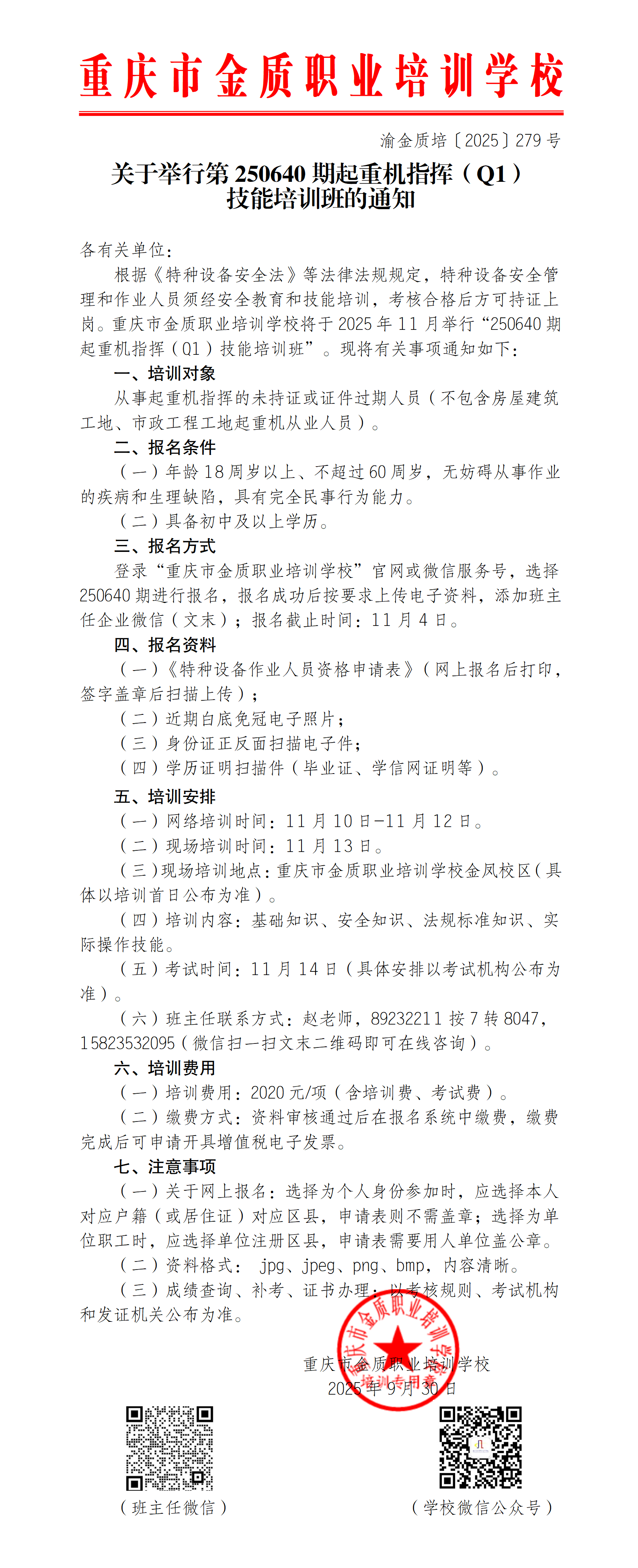 11月第250640期起重机指挥(Q1)技能培训班的通知