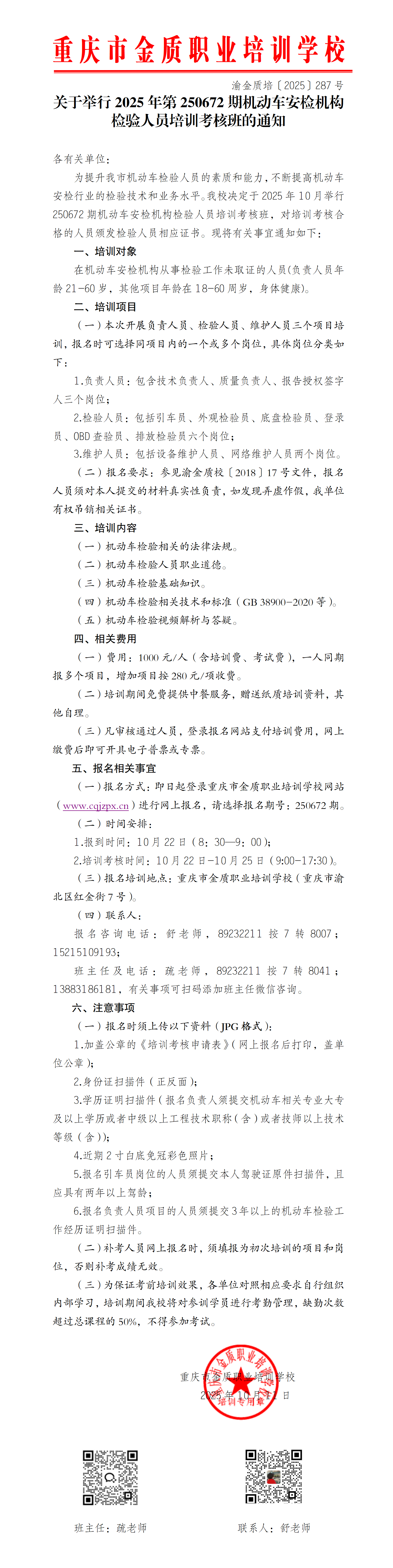 渝金质培〔2025〕287号关于举行2025年第250672期机动车安检机构检验人员培训考核班的通知.pdf