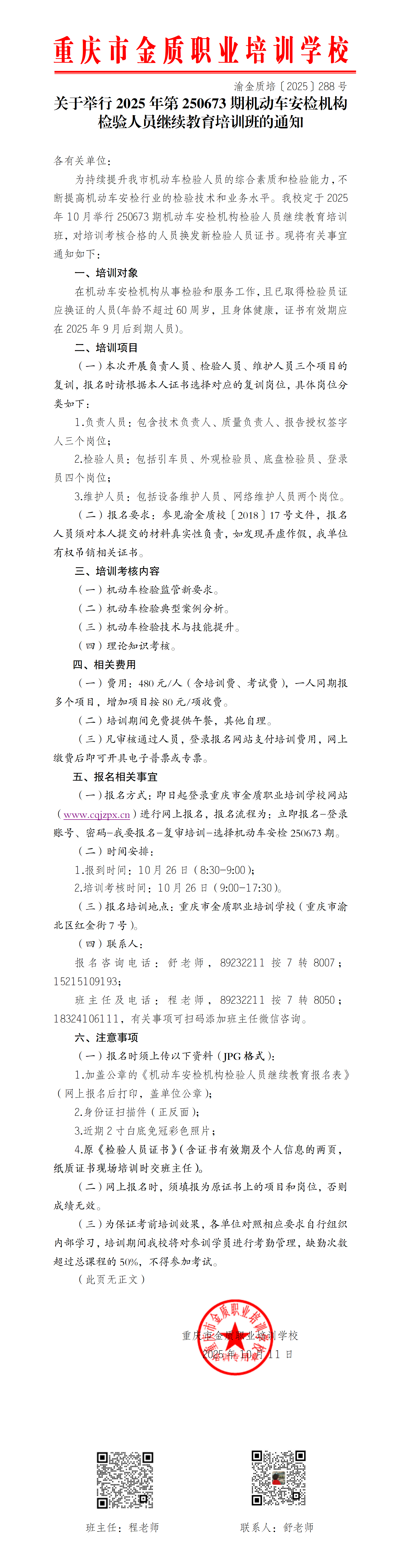 渝金质培〔2025〕288号关于举行2025年第250673期机动车安检机构检验人员继续教育培训班的通知.pdf
